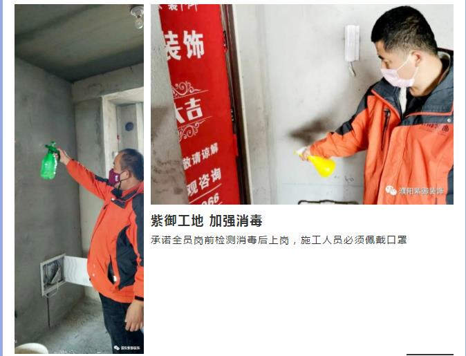 1、紫御裝飾工地每日加強(qiáng)清潔工作,保持環(huán)境整潔干凈,并按照要求展開消毒工作;